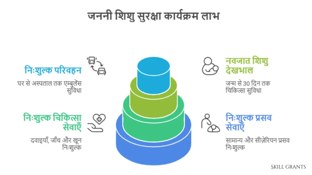 जननी शिशु सुरक्षा कार्यक्रम के अंतर्गत गर्भवती महिलाओं और शिशुओं को निम्नलिखित लाभ दिए जाते हैं:- निःशुल्क प्रसव सेवाएँ