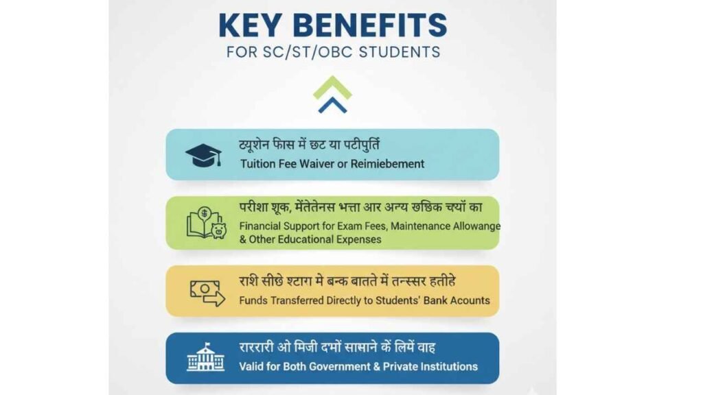 - SC/ST/OBC छात्रों के लिए टयूशन फीस में छूट या प्रतिपूर्ति