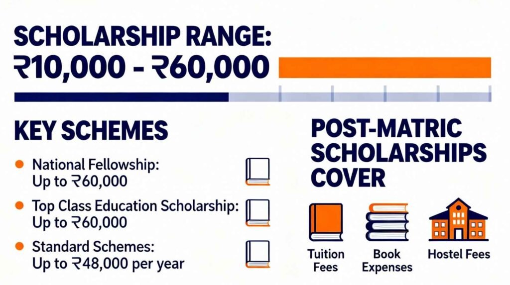 - विशिष्ट योजनाओं जैसे National Fellowship या Top Class Education Scholarship में ₹60,000 तक की मदद दी जाती है।