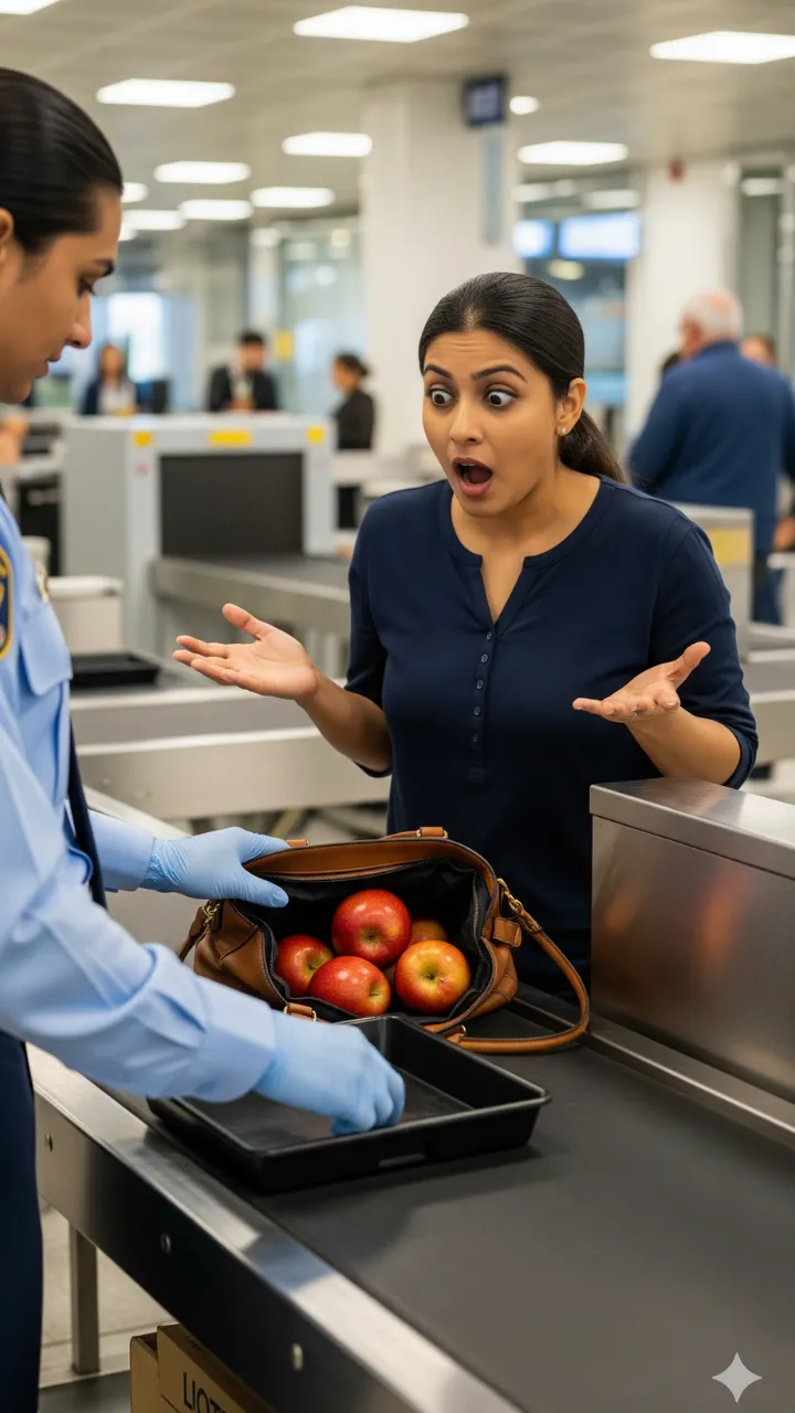 एक महिला का सेब ले जाने पर एयरपोर्ट पर चालान कट गया, जिससे सोशल मीडिया पर चर्चा शुरू हुई।